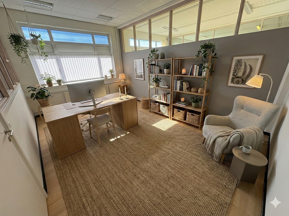 Kontorfællesskabet deles i dag med tre andre virksomheder, hvilket skaber et dynamisk og kreativt miljø.